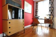 La muséographie repose sur un mobilier choisi avec soin. Dans le séjour, un ensemble de René Gabriel évoque l’appartement-type de 1947. La chambre d’enfants présente du mobilier de Marcel Gascoin, utilisé au Havre au début des années 1950. Le bureau illustre l’évolution vers le design français après 1954, tandis que la chambre parentale est meublée d’un ensemble signé André Beaudoin. Celui-ci met en valeur un mobilier de série, robuste, fonctionnel et conçu pour accompagner la modernité.