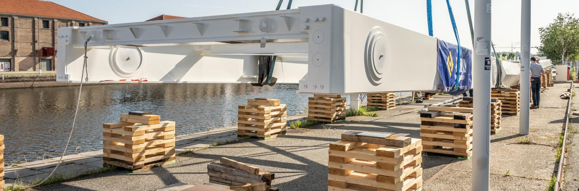 La passerelle Daniel Colliard en cours d’installation sur le bassin Paul Vatine
